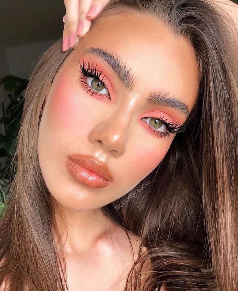 打在下巴上的腮红和脸颊上的腮红呼应起来,让整个脸部看起来就像粉嫩的水蜜桃。除此之外,它还能让下巴看起来更翘,提升脸部立体感。对于脸型偏长的妹子来说,还能在视觉上缩短下颚的长度。