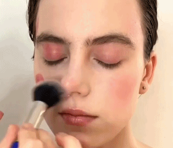 用小一点的晕染刷蘸取腮红后在鼻尖偏下一点的位置轻扫,也可以在鼻子的修容上稍稍叠加一些,过度晕染让妆面看起来更和谐。