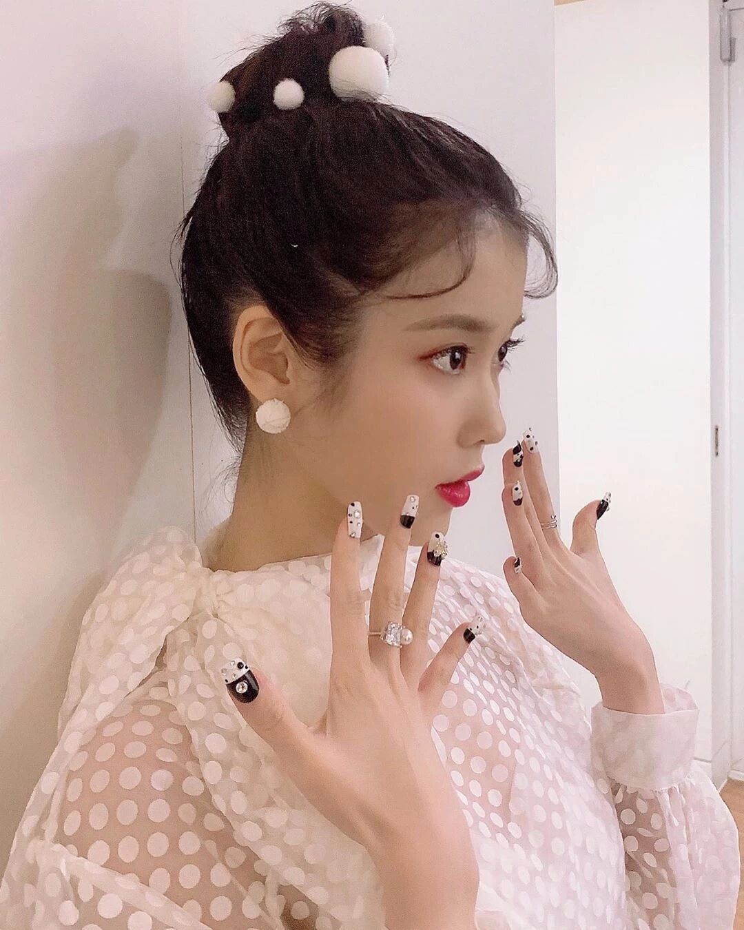 我们满月社长就连去吃拉面,认证打卡美食店也要换一手全新的美甲,决不允许出现在ins上的自己有一刻不精致,黑白波点拼接美甲点上闪亮水钻俏皮可爱,再配上同款毛绒发圈扎一个丸子头,减龄十足。