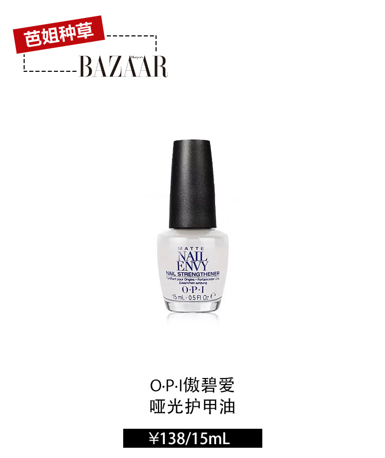 看腻了亮晶晶的甲油,不妨尝试一下哑光质地的甲油,可以叠涂在任意颜色的甲油上,一秒变哑光磨砂质地,收敛住原本颜色的亮泽,展现低调的奢华。这款甲油还有强韧美甲的功效,延长彩甲在手指的停留时间。