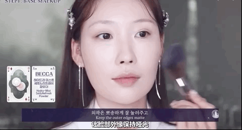 同样也是为了保留妆容的透明感,最后的定妆也需要控制好力度,脸颊两侧可以以按压的方式定妆,而脸部中间的部分轻轻的一扫带过就OK啦~
