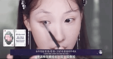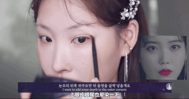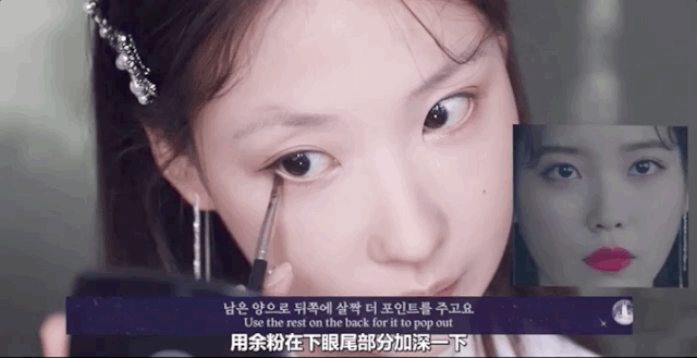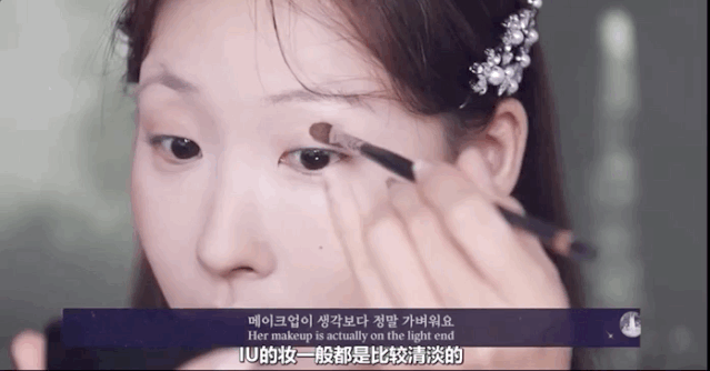 IU在剧中的眼妆基本都是以粉棕红棕色调为主的暖色系眼影,我们可以选择偏粉调的打底色平铺在上眼皮