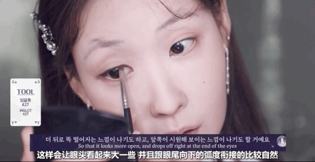 同时,上眼皮的眼尾部分也用深色稍作晕染和加重