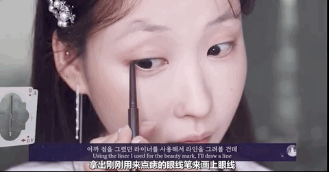 最后就是上眼线的部分了,用眼线笔画出内眼线在上眼尾的部分顺着向下平拉出去