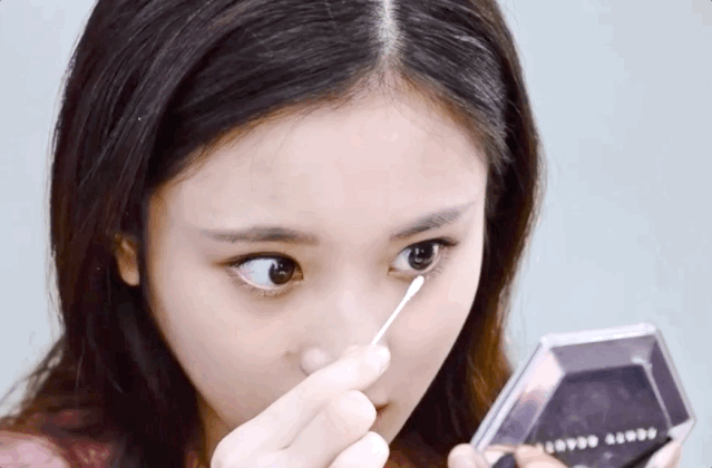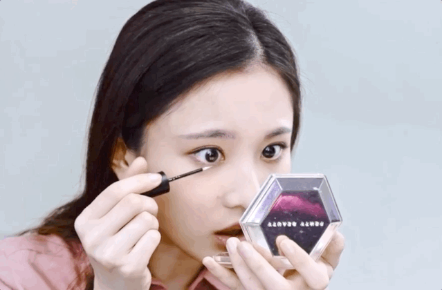 最重要的一步就是液体闪片眼影!在下眼睑的位置瞳孔下方少量涂抹,用手指轻轻晕开,给人一种楚楚可人感。
