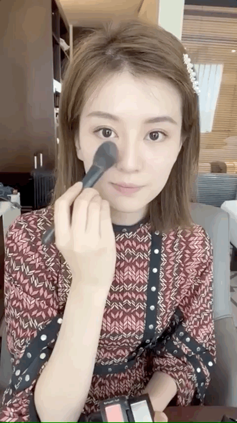 在正式上眼妆前,乔欣先用修容刷蘸取修容粉饼,从眉头开始向下画出了自然的鼻侧影