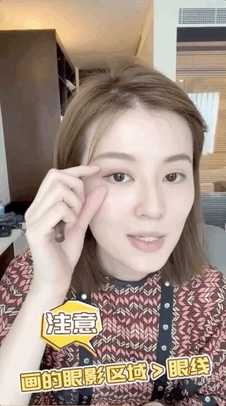 在画眼影的时候,打底色可以稍微晕染过双眼皮,但加深的眼影色尽量不要超过双眼皮的褶皱