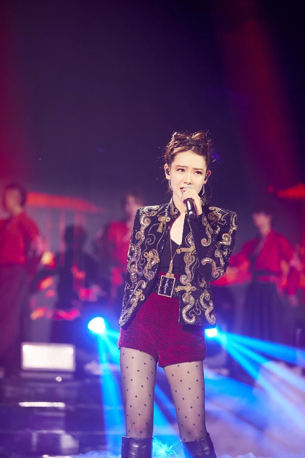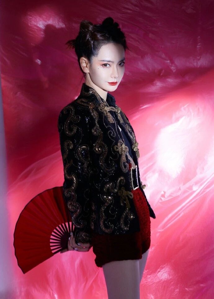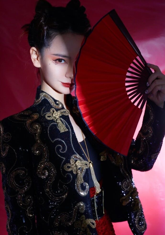搭配这个发型的饭第二套造型则是浓浓的中国风,刺绣珠片外套既传统又新潮,手持一把红色折扇颇有“江湖飒气“!