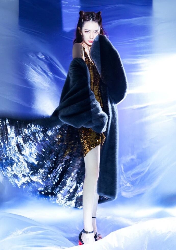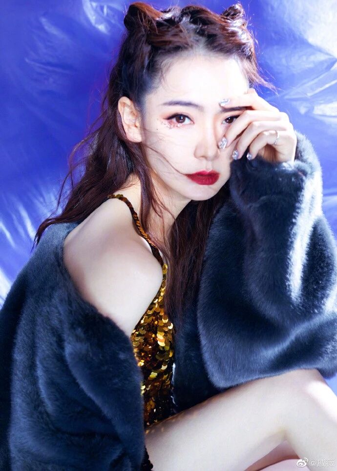 同样是半扎的双丸子头,戚薇第二套装扮与已经没有之前的风格了,金色亮片吊带裙和绒毛外套的反差搭配为她带来霸气的感觉。