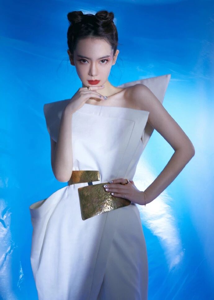 不光半扎,全扎的双丸子头也不仅是将散下的发丝缠绕上去,而是整体重新打造,整洁没有碎发的发型搭配线条十足的白裙,很有未来感。