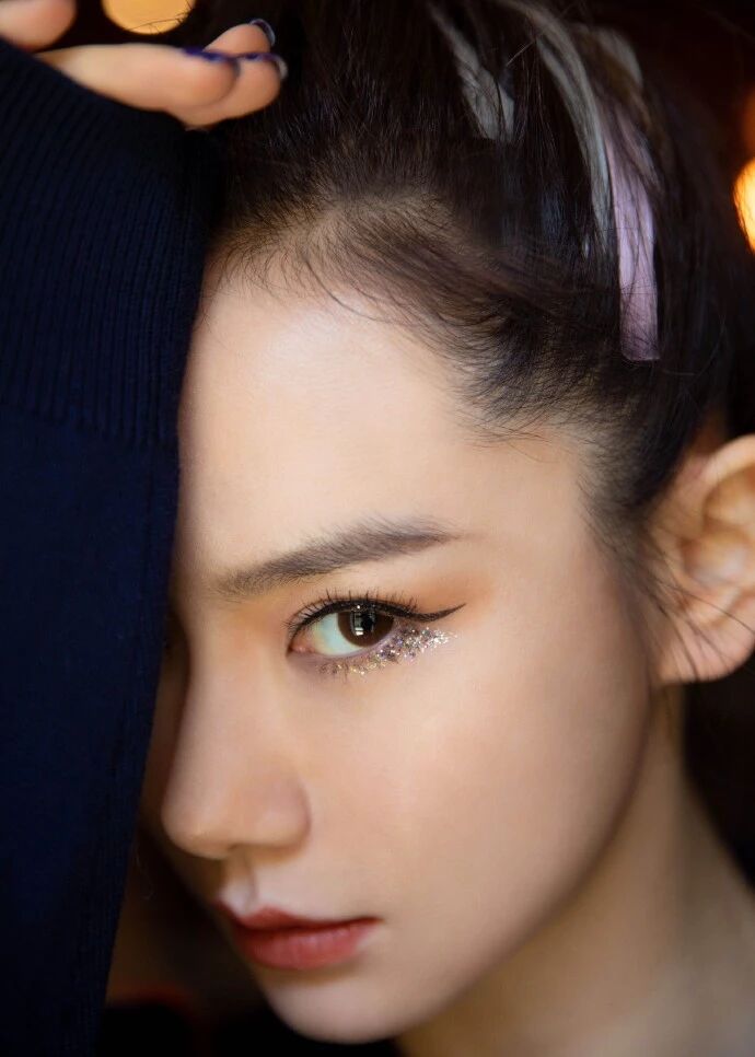 妆容上别出心裁的眼尾亮片加上红色晕染,精致又华丽。稍带凌乱的发丝又尽显随意,像刚上岸的人鱼公主一样。