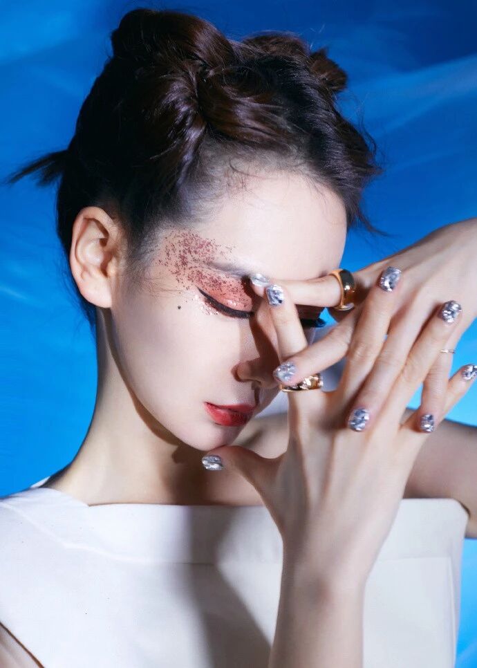 在妆容上的搭配又看见戚薇很爱的亮片元素,银色的选择十分吸睛,和唇色相配的奶茶色眼影轻微晕染,酷帅满分!