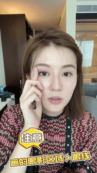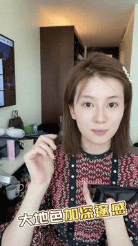 接着使用深咖色沿着双眼皮褶皱处向晕染,范围不超过双眼皮的宽度,然后用同一色块的眼影加深眼尾三角区域,眼睛的深邃感立刻就体现出来了。