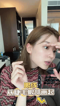 画眼线的时候要从睫毛根部画起,用手指指腹微微抬起眼皮,画一条内眼线来填充睫毛根部的空隙,接着再画一条拉伸至眼尾的外眼线。