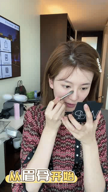 眼妆之前还要打一下鼻影,从眉骨沿着鼻梁向下轻扫,如果的鼻头有点肉肉的,可以在鼻头两侧加深一下,会起到缩小鼻头的效果哦!