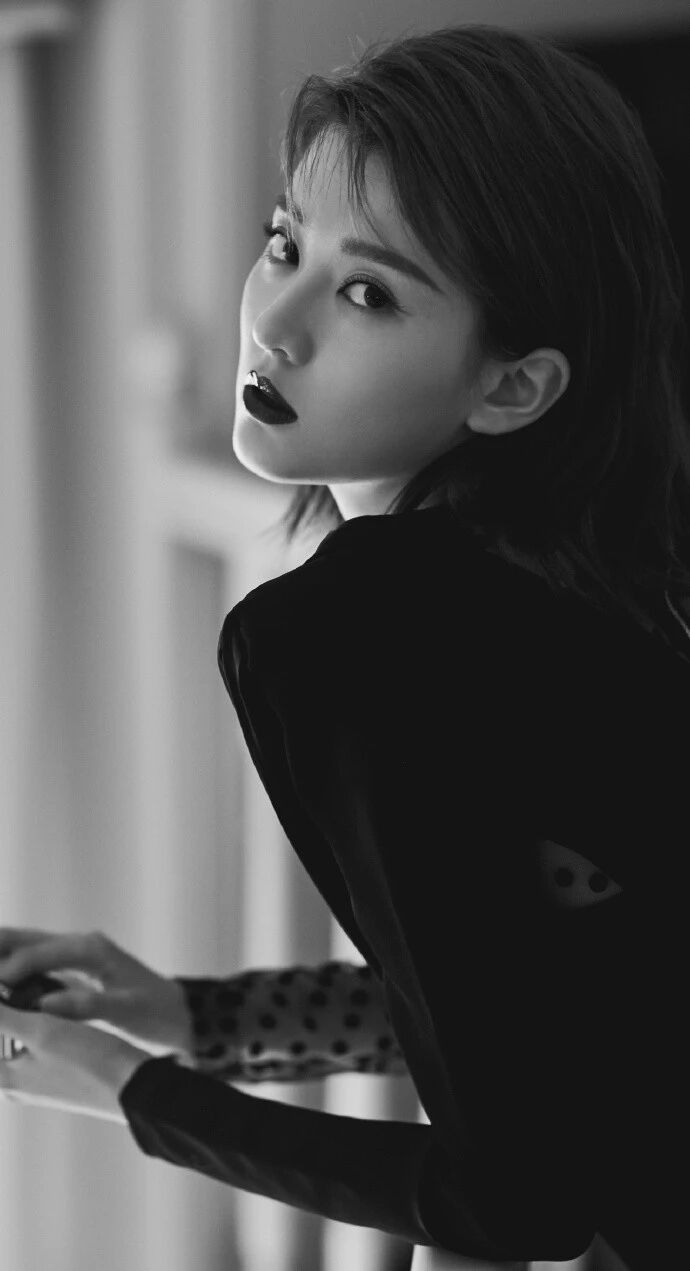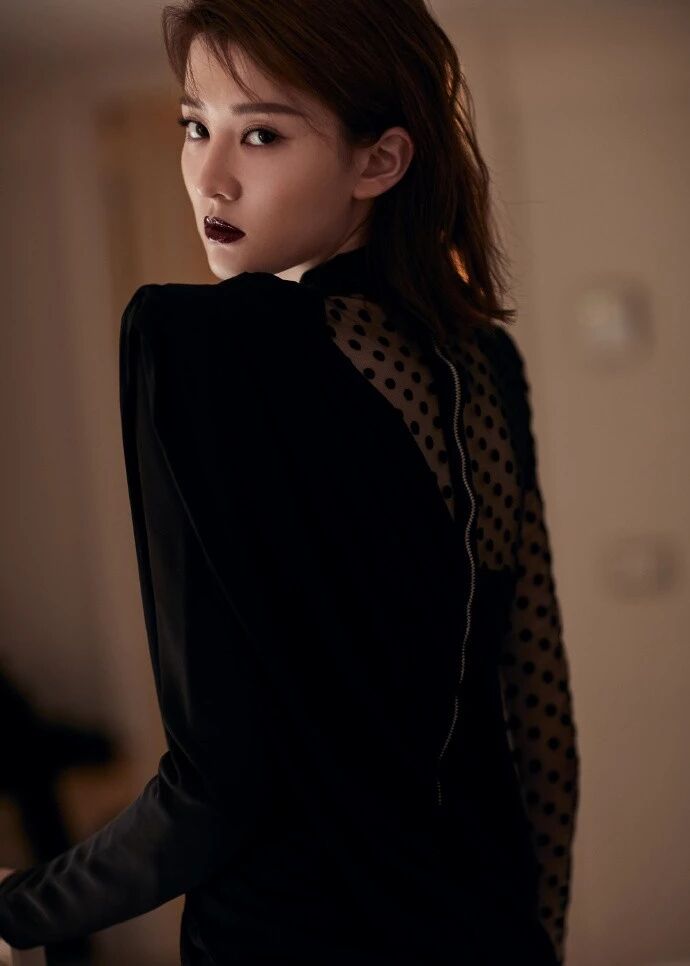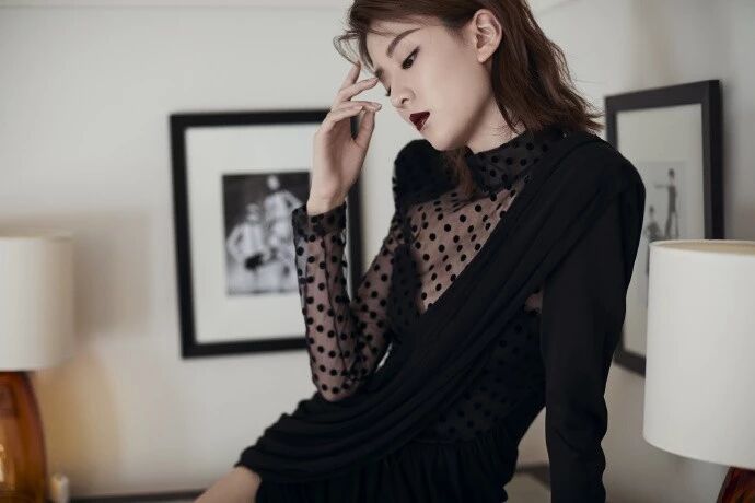 略带慵懒的姿势,眼神间也很有距离感,画上这样一个“暗黑妆”的乔欣不但不违和,反而像个“暗夜精灵”一样,高贵又“生人勿进”。