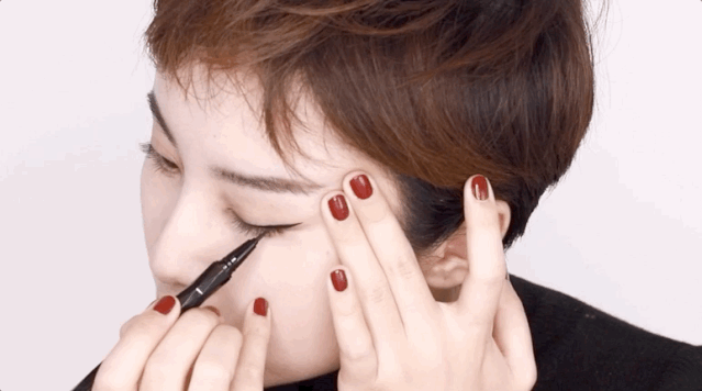 先用一只手轻轻向后拉伸眼皮,用眼线笔从眼尾逆向延伸,回到眼皮前三分之一处停止。