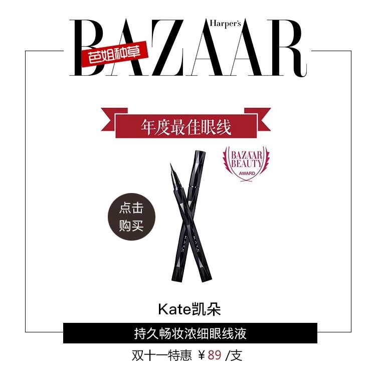 浓浓复古情怀的眼妆,猫眼眼线和浓密睫毛是重头戏。眼线用到的是KATE持久浓细眼线液,贴合指尖的9角型切割面握柄设计,可以帮助更稳定地描画精细线条。