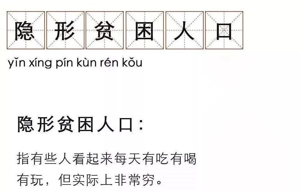 百度百科也将这些看起来每天有吃有喝有玩但实际上非常穷的一类人定义为:隐形贫困人口。
