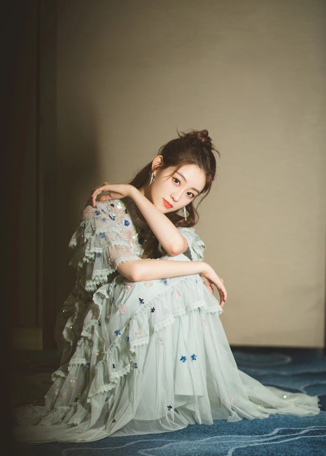 当天的妆容也是清新感十足,着色不重,把甜美的感觉化得刚刚好,尤其是若有若无的腮红,衬得祝祝有种朦胧感的少女美。