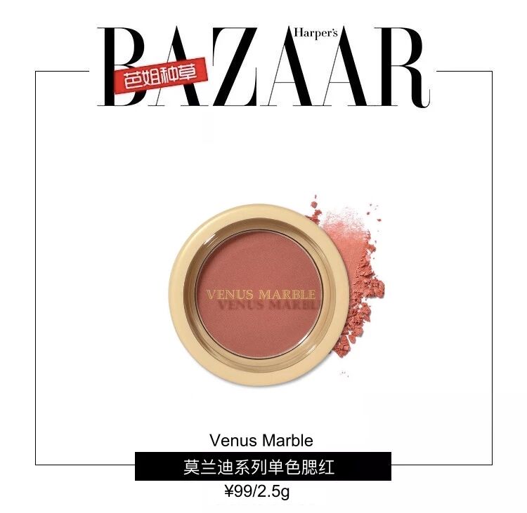 腮红也是整体妆容的关键之一,高级感的妆容一定是妆面整洁且层次感分明的。Venus Marble莫兰迪系列单色腮红就将颜色的饱和度做得比较低,就算你没有钟楚曦专业的化妆技术也能大胆打腮红。