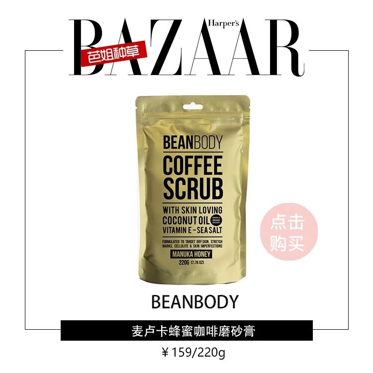 BEANBODY这款麦卢卡蜂蜜咖啡身体磨砂膏从外形上看就像是一包咖啡豆,一打开便能闻到醇厚的蜂蜜咖啡味,在配方中也添加了天然麦卢卡蜂蜜、罗布斯塔咖啡豆粉末,可以软化去除多余的角质,清洁毛孔脏污。