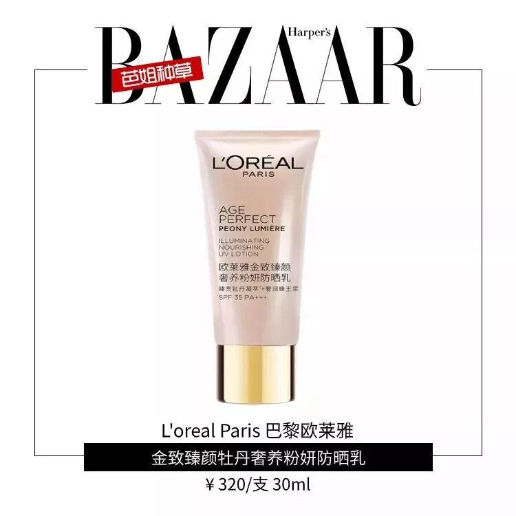 巴黎欧莱雅金致臻颜防晒乳,防晒指数SPF35,PA+++可以有效阻挡紫外线。这款防晒乳更是蕴含牡丹精粹和蜂王浆,在抵御外部侵害的同时深度滋养肌肤,使皮肤更加紧致细腻。