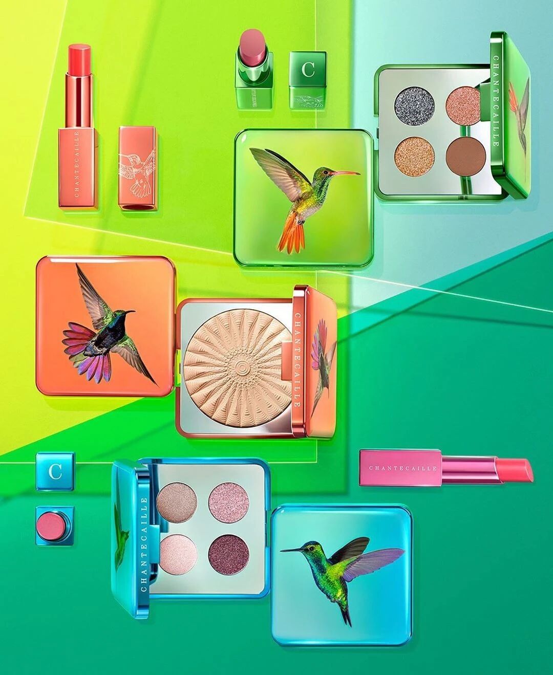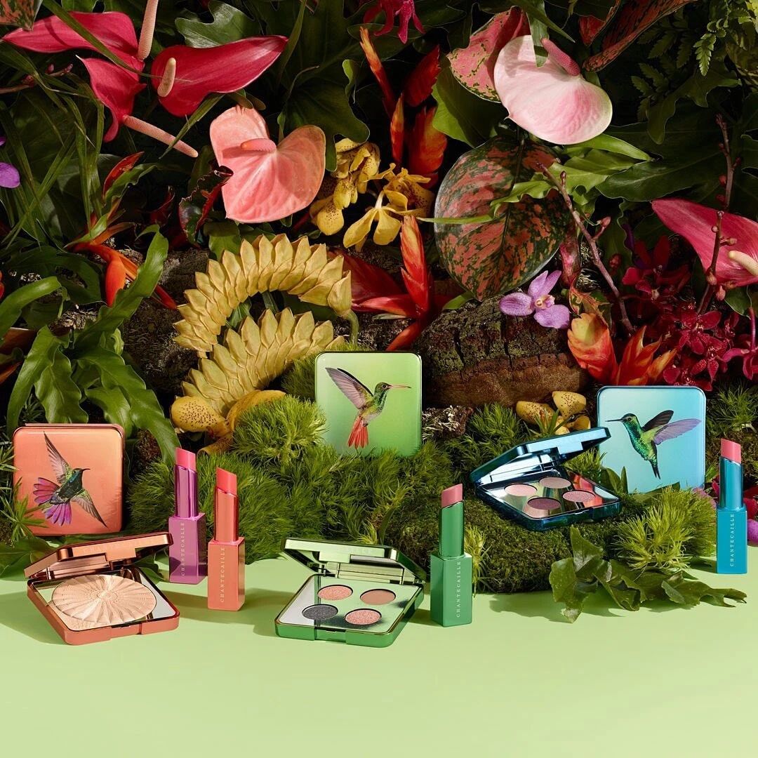 全系列的包装设计带有浓浓的热带雨林色彩,产品包含两款四色眼影盘、四款变色润唇膏和一款蜜粉饼。