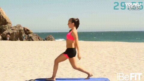 Step5: 向前迈腿,前腿弯曲90度,后腿尽量向后伸,腰部左右转动,双手握住保持平衡。