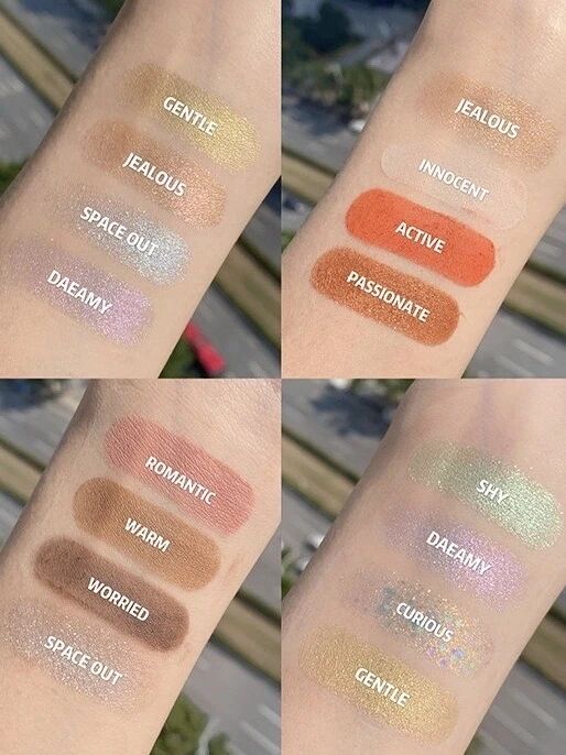整盘配色以轻快高彩度的清透亮片色为主,可以任意搭配其他的哑光眼影,点缀在眼皮中间别提多仙了,秒变活泼轻快的春日少女~