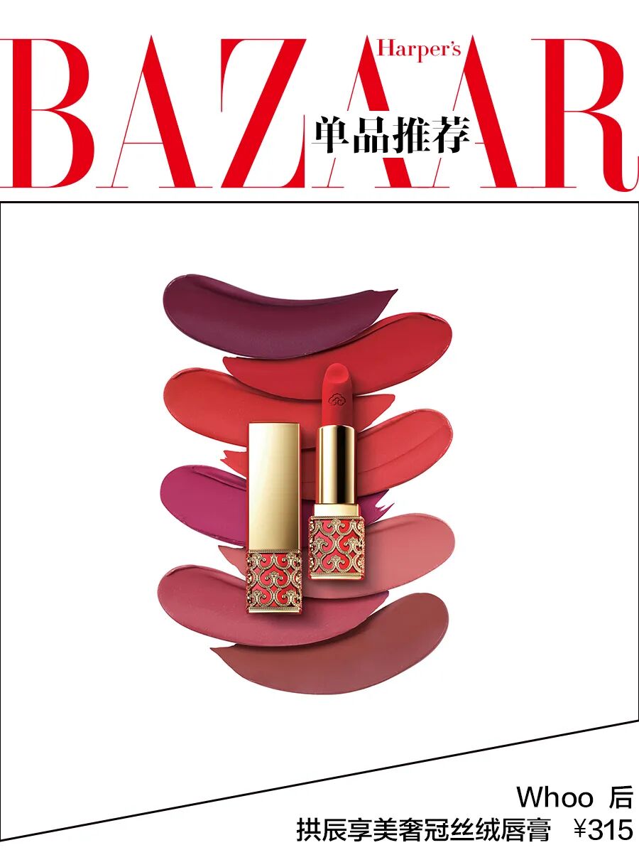 全新推出的Whoo后拱辰享美奢冠丝绒唇膏以其时尚精简的方管设计闪耀问世,融合焕金华彩的管身,汲取古典宫廷“新罗金冠”为灵感,经典的荷花刻印镶嵌于锥形膏体之上。研磨妆前乳原料,有效抚平唇部细纹,均匀显色,助力打造丝绒般柔和双唇。