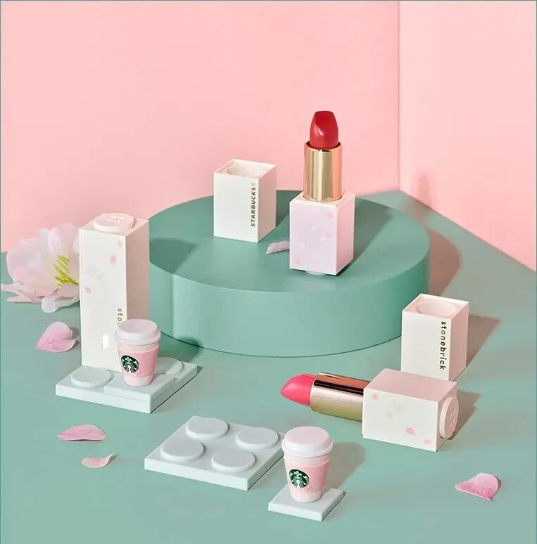每年春季各地的星巴克都会推出樱花系列,这次韩国星巴克门店与当地小众概念彩妆品牌stonebrick推出了联名系列彩妆。联名周边包括两款樱花色口红以及若干带有樱花元素的配件。