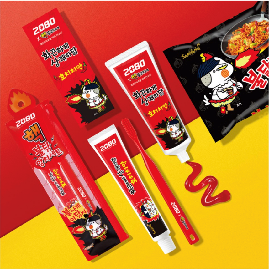 三养食品旗下的火鸡系列一直都是众多品牌的合作对象,这次他们与韩国爱敬集团的2080牙膏品牌合作,带来2080Hochi牙膏。Hochi既有“皓齿”的意思,亦是火鸡面的代言人Hochi的名字。