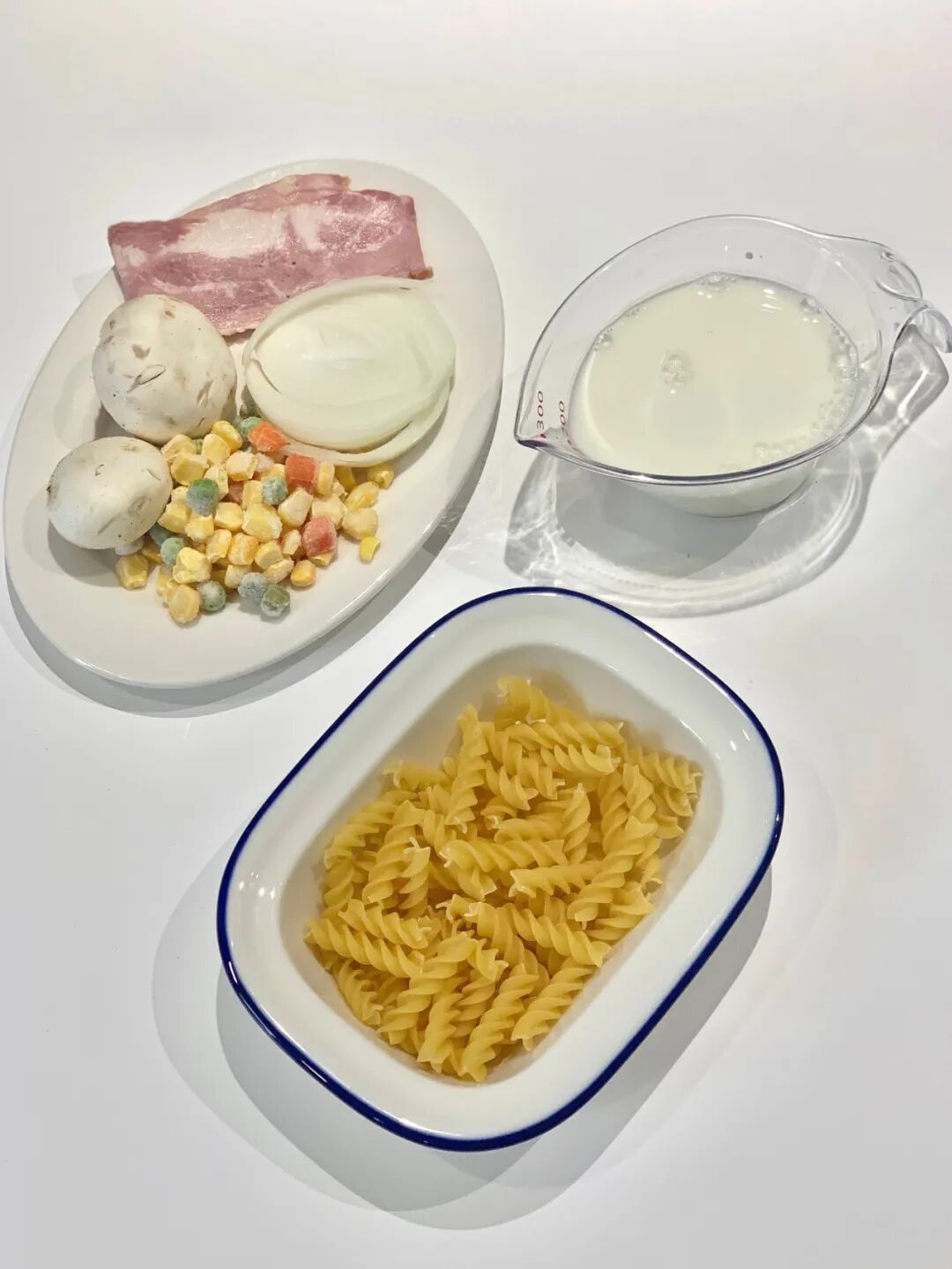 准备食材:意面一小碗、蒜2瓣、洋葱切一片、口蘑2个、培根1片、玉米粒一小把、牛奶150ml(对于没有秤的朋友来说,这个用量会比较易懂~)