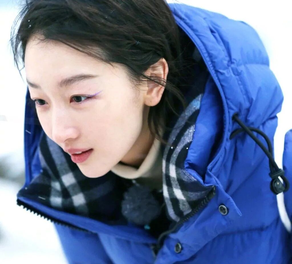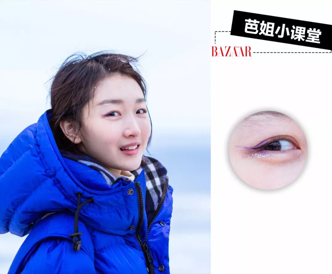 周冬雨在《小小的追球》里为了搭配被冰雪环绕的北极的冷色调,特别打造的北极妆就选择了淡紫色的眼线。