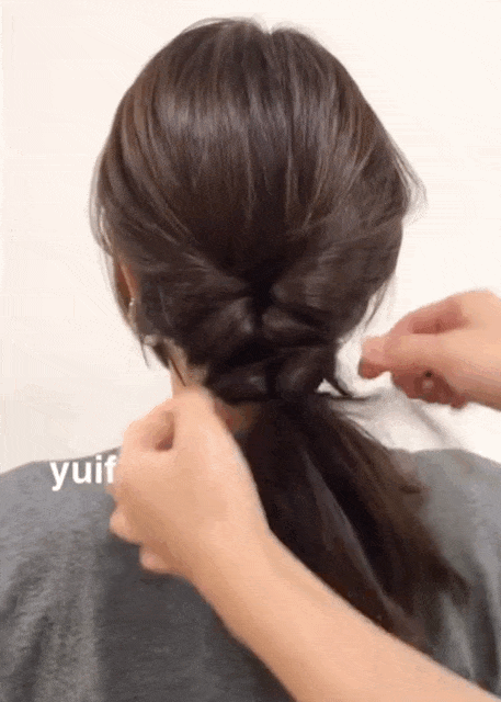Step 2: 把头发从中间拨开,将绑好的马尾从中间翻转过来,接着在发尾部分再重复一次步骤1和步骤2。