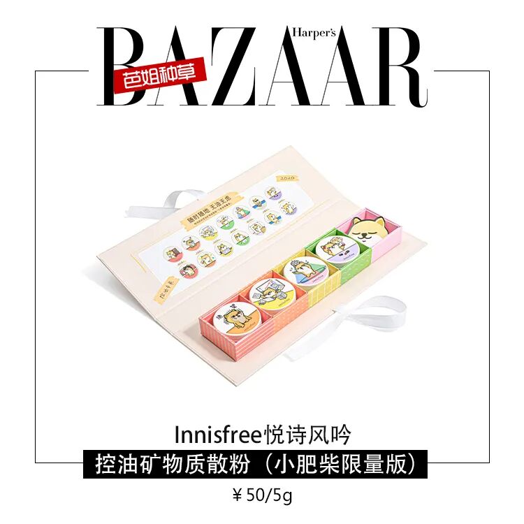 悦诗风吟的控油矿物质散粉小小的一盒十分方便携带,随时随地都能拿出来补妆。小肥柴的限定包装简直满足了完全少女,通过小肥柴的形象实力演绎散粉的一周使用说明,轻扫就能持妆控油,抵御暗沉,蕴含薄荷成分,让你清凉一夏。