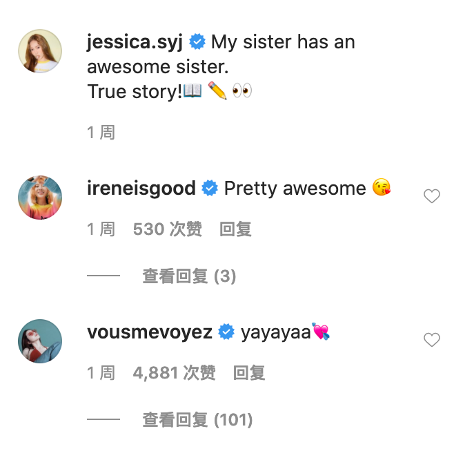 姐妹二人经常在Ins上面互动,真的是现实版“对你爱爱爱不完”!你更是能经常在姐姐Jessica的Ins看到不爱发照片的妹妹Krystal,跟姐姐在一起的Krystal总能放下心中压力,一改往日高冷形象,可以捕捉到超级多可爱的小表情。