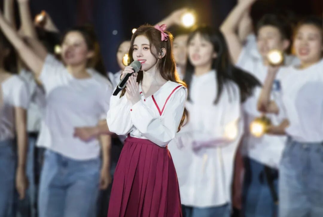 人美歌甜的鞠婧祎放不管走到哪儿都是那个耀眼的存在,穿上学生气十足的制服、头戴粉色蝴蝶结发饰,一双略带笑意的眼睛完全就是闪闪发光。