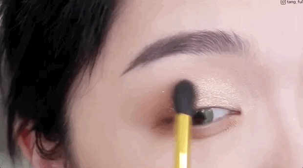 打底晕染的颜色可以是橙色,而提亮色则可以选择金黄珠光色来制造层次感,不然会让眼妆画起来很平很显肿哦~