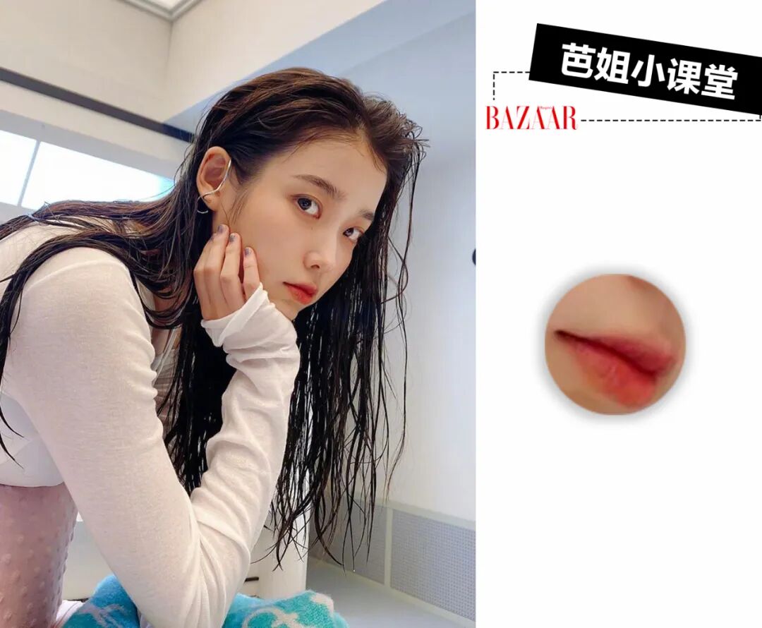 最后,唇妆的部分IU选择了比较有水光感的产品来增加唇部的立体感,也让整体的妆容看起来更加有光泽度。