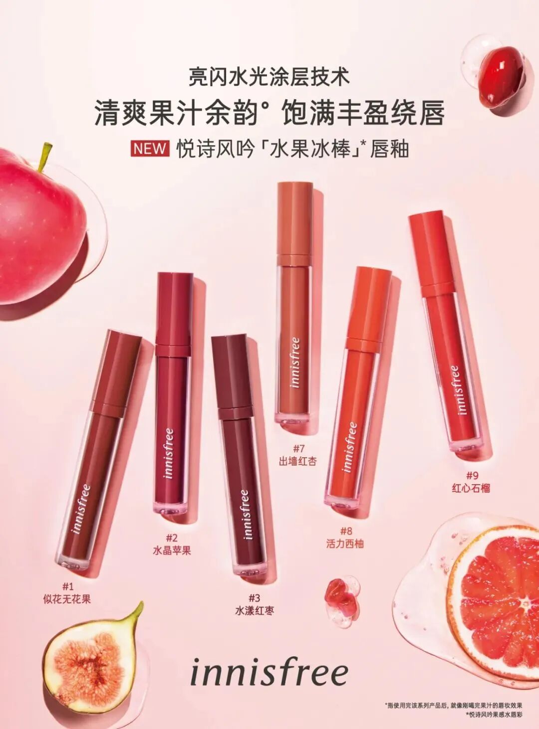 还有什么比水果冰淇淋更适合夏天的元素呢?新鲜的水果会过期,但果感的水润唇妆不会。悦诗风吟将五颜六色的水果,运用到了唇釉上,推出了全新的果感水唇彩唇釉,夏日限定非它莫属。