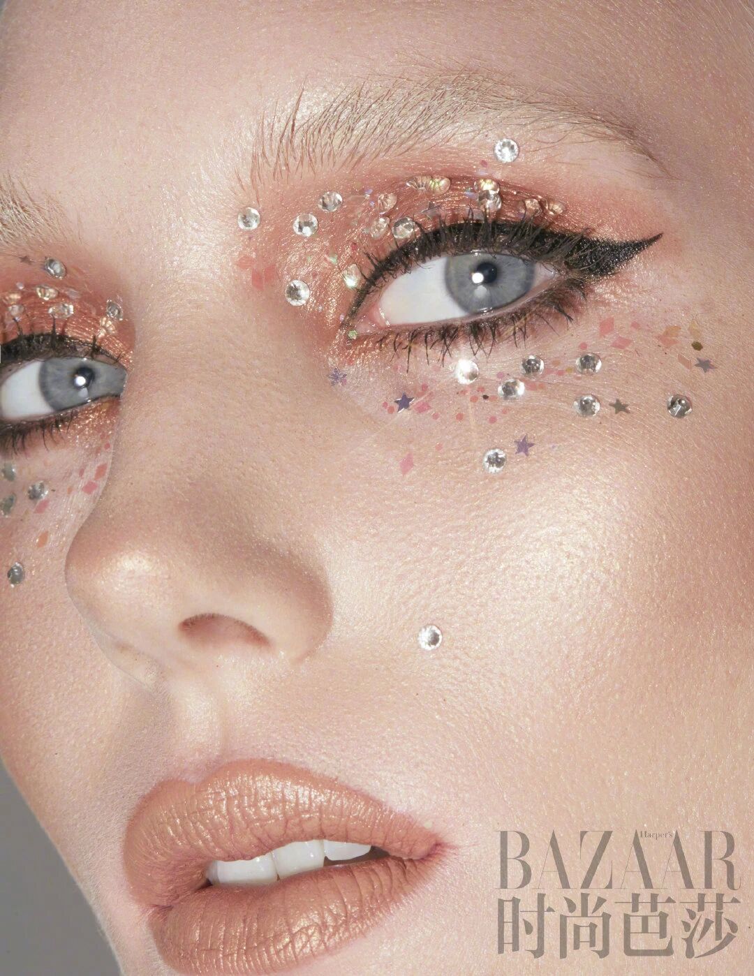 夏天到啦!别再画千篇一律的大地色眼影了!亮片眼妆各位姐妹们安排一下~闪片、小钻点缀在颧骨和下眼睑,真的很仙~