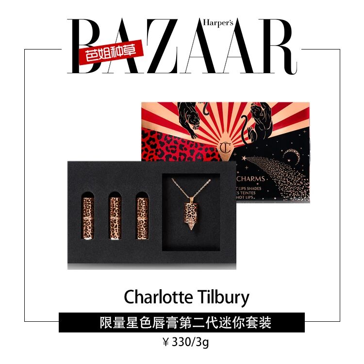 Charlotte Tilbury全新的星色唇膏第二代迷你套装包含了三个色号:油画般妆感的柔和酒红色明艳维加拉、鲜明经典红色佩茜红,含有3D闪耀粒子的沙滩感玫瑰茶色光采珍妮弗。整体玫瑰金妆点豹纹的包装设计,非常优雅摩登。唇膏的质地丝滑丰润、显色度饱满浓郁,让你随时随地都闪耀。