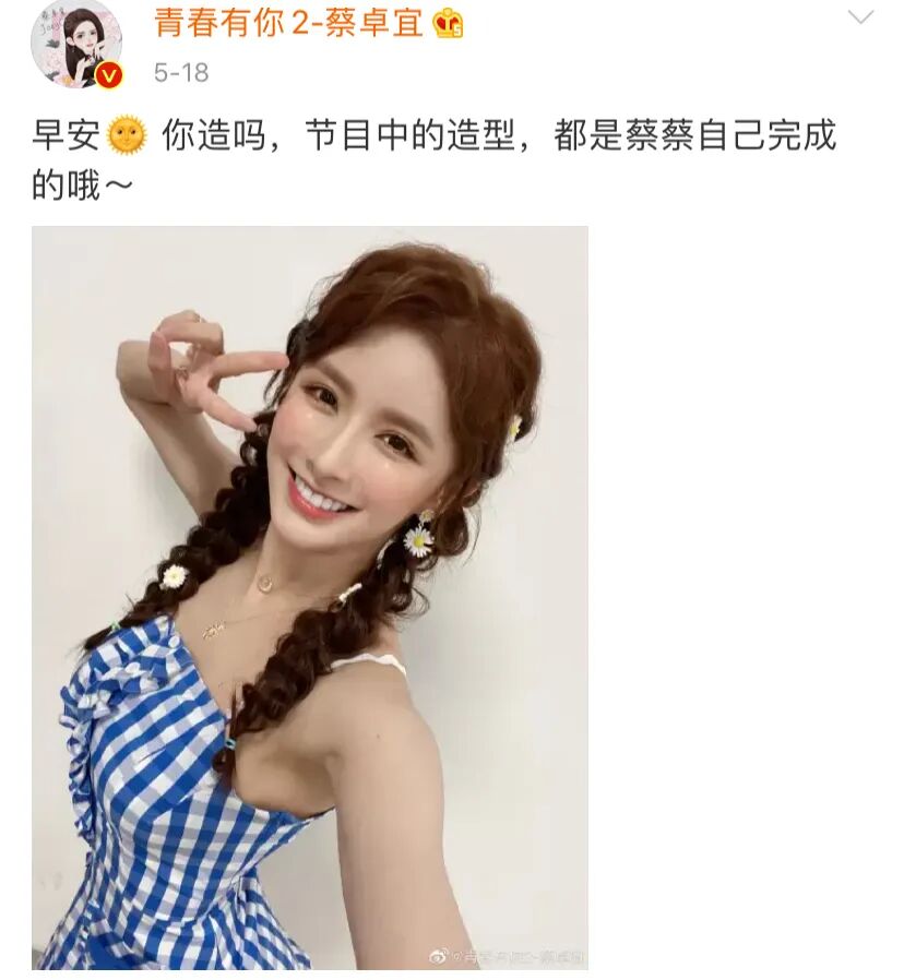 看完了宁静姐姐的小脸操,就不得不说在《青春有你》第二季又当自己的造型师又热衷于营业自己的“少女Massage快闪店”的蔡卓宜小姐姐了,可谓是不同的女团,同样对小脸的追求。