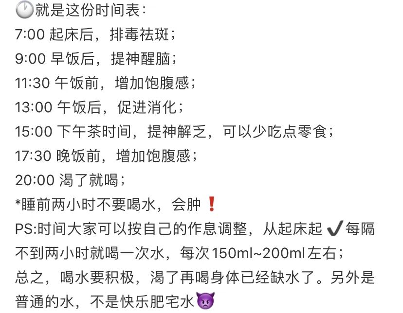 不是随便拿起来直接咕咚咕咚,要有时间讲究的,根据阿娇的分享看,从起床开始每隔两小时左右就要喝一杯150~200ml的水。