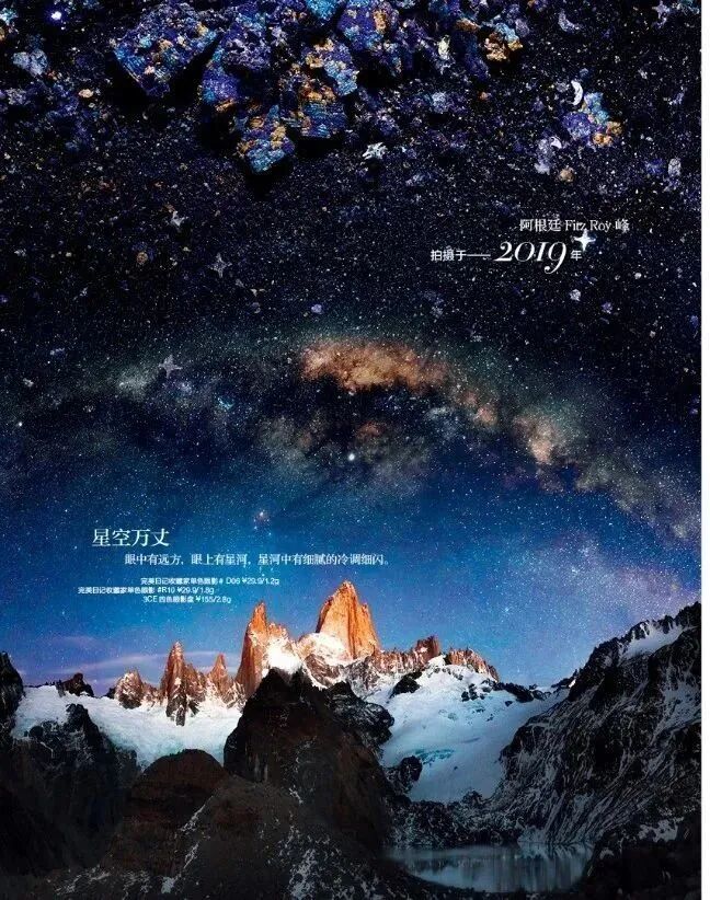 眼中有远方,眼上有星河,星河中有细腻的冷调细闪。这幅用眼影打造的星河画卷,是2019年拍摄于阿根廷fitz roy峰的作品