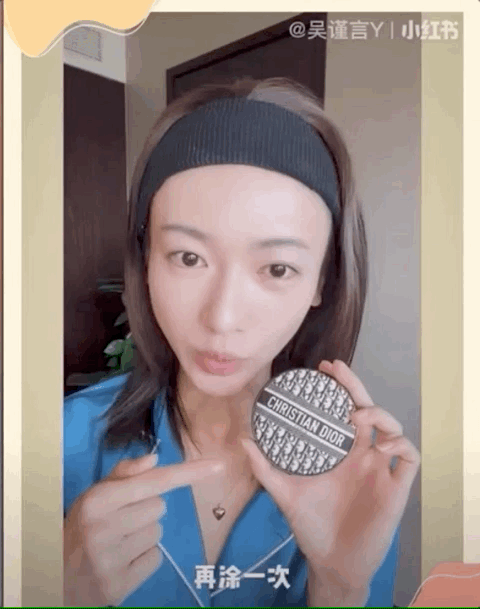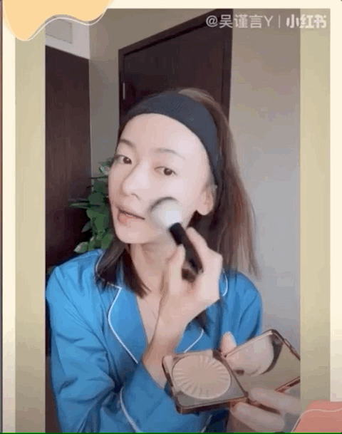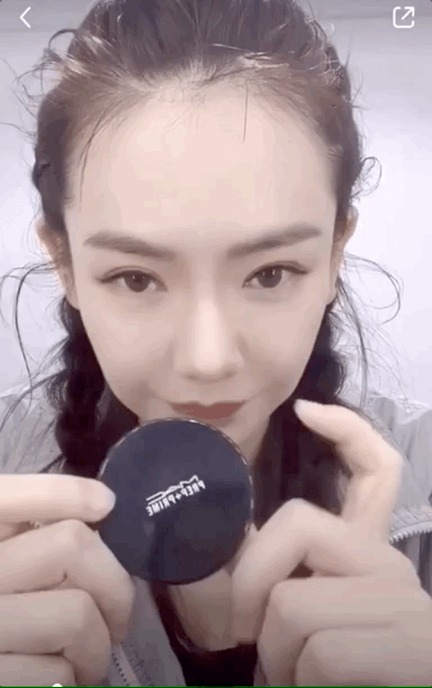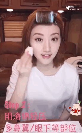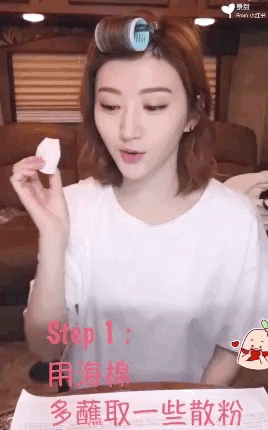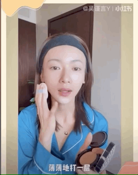 Step3:第三步就是再在散粉上轻压一层气垫底妆,按照她的话说就是,即便脱妆,“脱”掉一层还有一层,所以不会让妆容发生太大的变化。