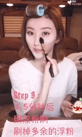 Step1:在你化好妆后先在面部扑一层散粉,主要选择散粉而非粉饼,散粉的粉质颗粒更为松散一些,轻扫上脸妆感更轻薄。