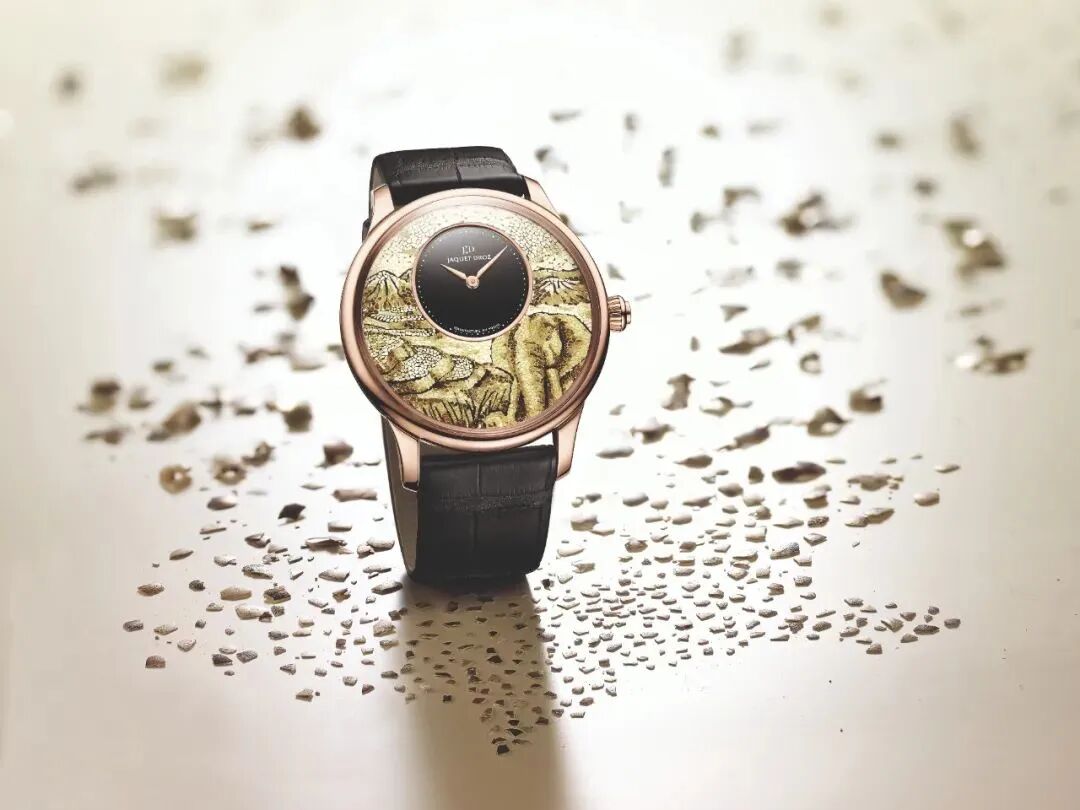 使用微缩处理后的鹌鹑蛋壳拼镶工艺,在直径43mm的小小表盘上,使用2000多片蛋片,组合成大象于稻田之中的悠闲景象,工艺卓越精密。